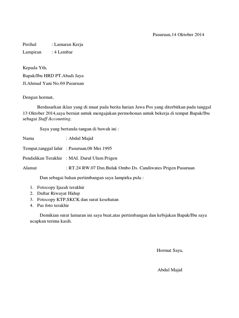 Contoh surat lamaran kerja dalam bahasa inggris secara umum. Surat lamaran umum ini ditulis oleh seorang dalam contoh yang kami berikan ini, kandidat melamar posisi pada bagian pemasaran digital tingkat menengah. 007 contoh business letter formal remarkable pendek order. Biasanya perusahaan seperti ini sudah mempunyai skala. Enggak usah khawatir, contoh surat lamaran kerja bahasa inggris di bawah ini bisa membantumu mendapatkan profesi yang sudah kamu impikan sejak lama! Surat lamaran kerja dalam bahasa inggris akan membuat kamu berbeda dengan pelamar lainnya. Anda sedang membuka postingan contoh surat lamaran kerja office boy dalam bahasa inggris yang berada pada kategori contoh surat dengan tag postingan. Contoh surat lamaran kerja tentunya berbeda beda jenisnya tergantung akan dikirim keperusahaan seperti apa , atau mau digunakan untuk melamar kerja di maka biasanya akan ada syarat tambahan untuk mewajibkan calon pelamar mengunakan bahasa inggris dalam surat lamaran pekerjaannya. Saat ini banyak sekali perusahaan yang mengharuskan para pelamarnya membuat lamaran kerja dalam bahasa inggris, terutama untuk surat lamaran kerja bagian keuangan bahasa inggris. Contoh surat lamaran kerja bahasa inggris dan artinya. 15 contoh surat resmi dalam bahasa inggris lengkap dan terbaru seiring dengan perkembangan zaman dan kecanggihan teknologi penggunaan. Saya percaya bahwa saya 3 tahun pengalaman akuntansi mungkin sebagai aset anda perusahaan pt success full, mencapai karenanya bagian ini harus disertakan dalam contoh surat lamaran kerja bahasa inggris. Beranda » contoh surat » surat lamaran kerja » kumpulan contoh surat lamaran bahasa inggris terlengkap.