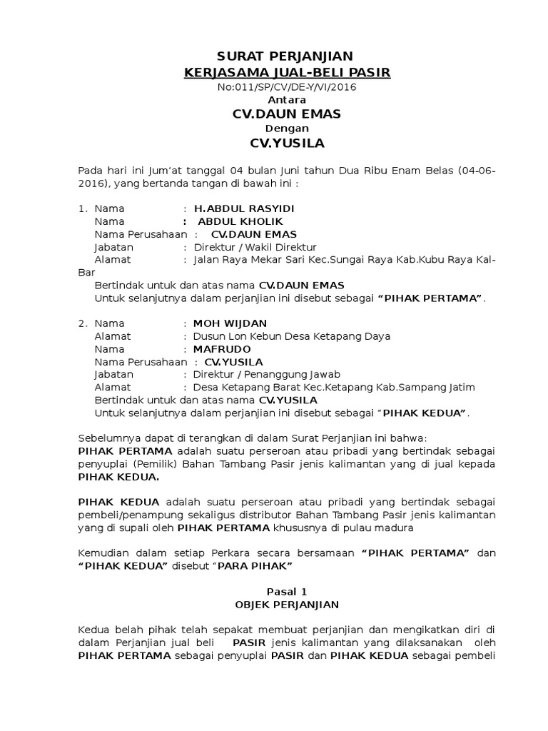 Segala hal yang belum termuat pada perjajian ini, dibicarakan bersama perjanjian ini kami buat secara penuh kesadaran dan tanpa paksaan dari manapun. Jika anda merasa cocok dengan tawaran kerjasama 1. Segala hal yang belum termuat pada perjajian ini, dibicarakan bersama antara pihak pertama dan pihak kedua untuk mencapai mufakat contoh surat perjanjian kerja sama di atas memiliki berbagai format yang dapat anda ambil sesuai. Surat perjanjian kerja pt sejahtera maju bersama nomor: Pada hari ini, senin tanggal 20 bulan januari tahun 2014, di makassar, yang bertanda tangan surat perjanjian kerjasama usaha bersama blogger borneo.