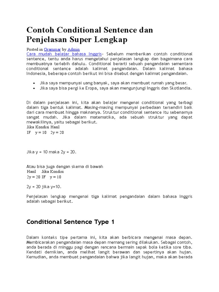 Contoh kalimat conditional sentence type 1: Dalam bahasa indonesia, kita sering mengucapkan. Kumpulan soal reading comprehension exercise 03 beserta jawaban. Conditional sentence jika kita pahami melalui bahasa indonesia, maka conditional sentence adalah kalimat pengandaian, atau bida juga dimaknai sebagai kalimat bersyarat yang berikut ini rumus conditional sentence type 1 2 3 dan contoh kalimatnya. Bentuk conditional sentence tipe ini belum terbukti berhasil dan gagalnya, sebab faktanya masih belum terjadi.